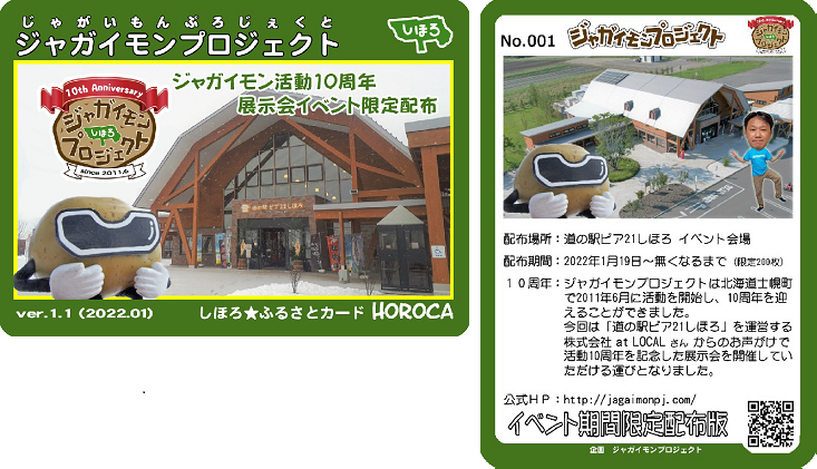 ここ数年、ダムカードやマンホールカードのように、それぞれの地域にカードをもらいに行くという取り組みがブームになっています。 北海道内だけを見回してもこれ以外にも、北海道かけ橋カード、北海道先人カード、北海道選奨土木遺産カード・・・ 様々な組織やプロジェクトがそれぞれ色々なカードを作成して無料で配布しています。 これをたくさん集めて回ってコレクションしている人も多いとか。 今回ジャガイモンプロジェクトで゛はそんなカードの ” しほろバージョン ” を作成して町内各所で無料配布する取り組み、「 HOROCAプロジェクト」 を始めました。
