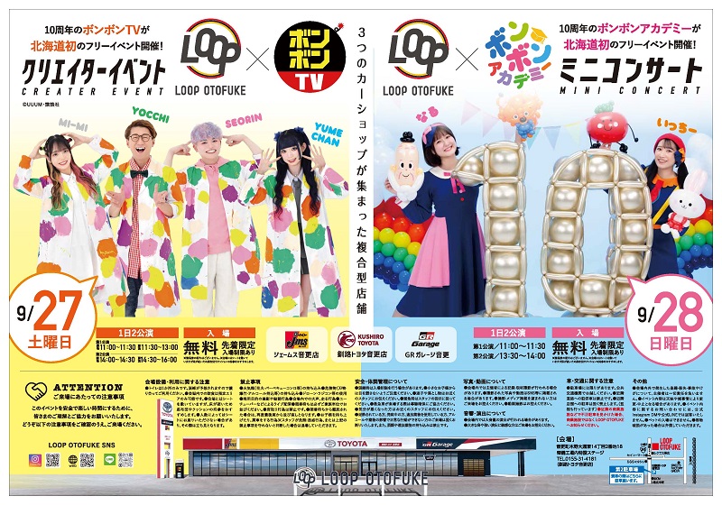 「ボンボンアカデミー いっちー&なる ミニコンサート in LOOP OTOFUKE」開催!【日程】2025 年9月28日(日)【会場】LOOP OTOFUKE 整備工場内特設ステージ【入場料】無料(*先着順・整理券の配布はございません。) 【出演時間】第1公演:11:00〜11:30 第2公演:13:30〜14:30 pic.twitter.com/NoZtaYIw3q