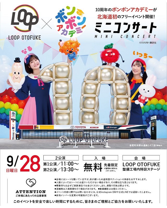 「ボンボンアカデミー いっちー&なる ミニコンサート in LOOP OTOFUKE」開催!【日程】2025 年9月28日(日)【会場】LOOP OTOFUKE 整備工場内特設ステージ【入場料】無料(*先着順・整理券の配布はございません。) 【出演時間】第1公演:11:00〜11:30 第2公演:13:30〜14:30 pic.twitter.com/NoZtaYIw3q— ボンボンアカデミー ?/全国の書店でえほん発売中?? (@bom2ac) September 22, 2025